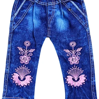 Girls Denim Jeans with Pink Floral Embroidery (Blue)