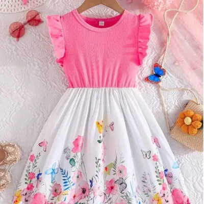 Summer Dress for Baby Girl/Frocks for Baby Girl/Baby Frocks Girl Poly Rayon/Casual Dress Short Flutter Sleeve (pink)