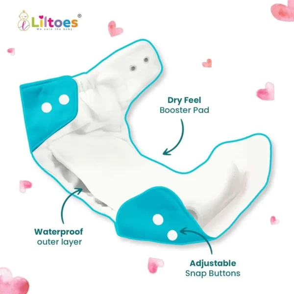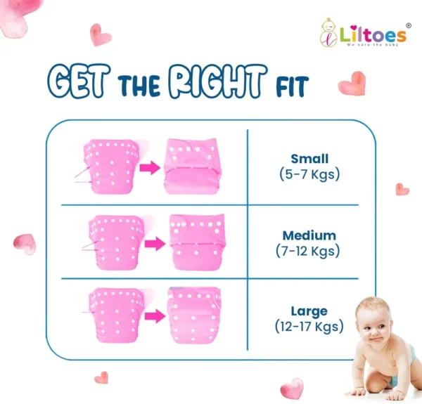 The diaper features smart snap buttons that allow easy adjustment to multiple sizes (S, M, and L), making it suitable for babies from the newborn stage until potty training. This adjustable design allows parents to use the same diaper as the baby grows, making it a cost-effective and practical choice.