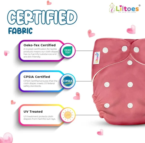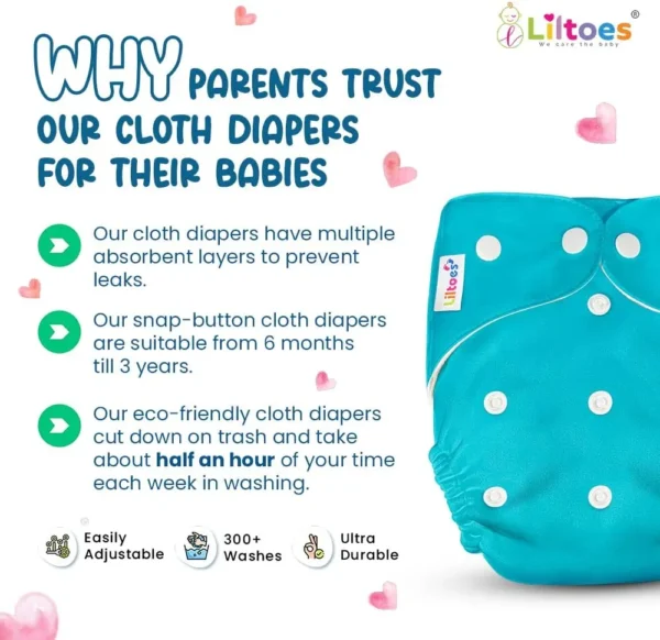 Reusable adjustable cloth diaper with soft cotton material and absorbent inserts. Designed with smart snap buttons for a comfortable fit from newborn to toddler.