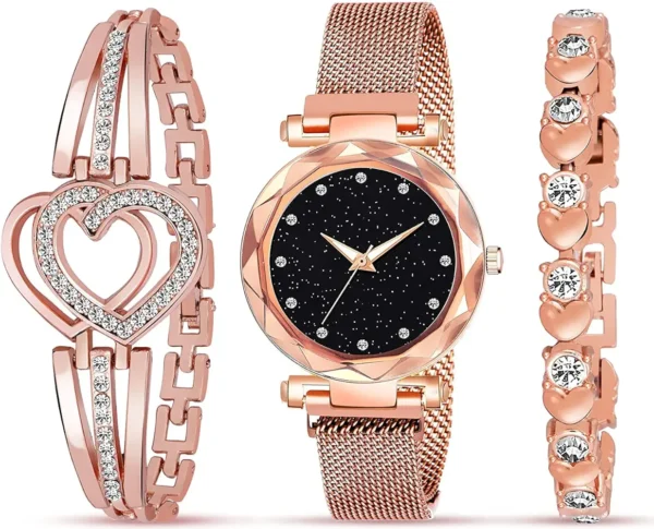 This stylish analog watch features a beautiful black dial decorated with sparkling diamond studs for a premium look. The magnetic strap ensures a secure, adjustable, and comfortable fit on your wrist. Designed for both casual and party wear, it adds a touch of elegance to any outfit. Perfect for those who love modern fashion with a luxurious feel
