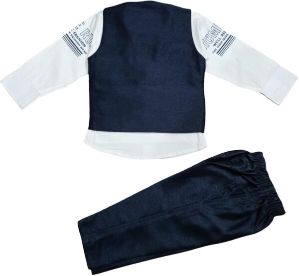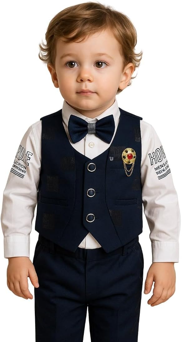 Baby Boy Formal 3-Piece Suit with Waistcoat includes a stylish navy blue waistcoat, formal trousers, white shirt with printed sleeves, and a matching bow tie.