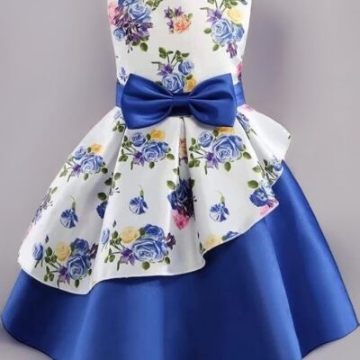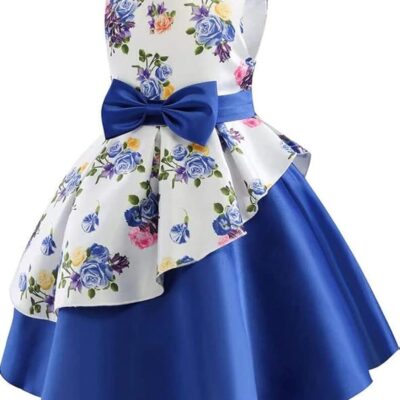 Girl’s Satin Floral Printed Frock Knee (Blue)