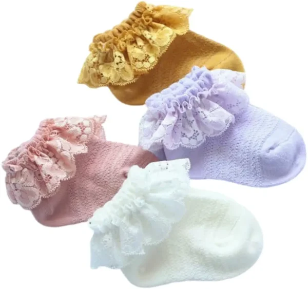 Soft cotton baby girl socks with elegant ruffle lace design, perfect for everyday comfort and cute styling.