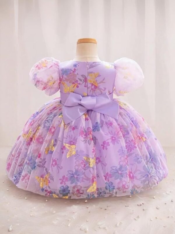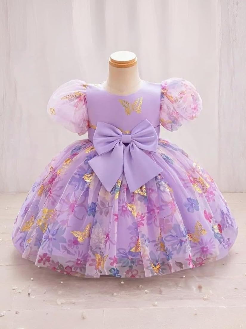 Baby Girls Fit and Flare Knee Length Dress – Elegant butterfly print dress with puff sleeves and a layered tulle skirt for a princess-style look.