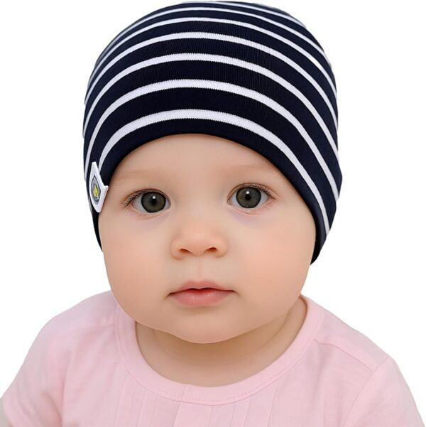 Keep your baby comfortable and protected with this black stripe stretchable knitted baby cap made from a soft cotton blend fabric. Crafted using ultra-soft knitted cotton, the cap is gentle on delicate baby skin and helps protect your baby’s head from wind and cool weather.