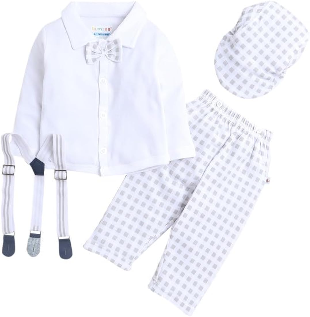 The set includes 1 printed full sleeves shirt, 1 pant, 1 suspender, and 1 cap for a complete stylish outfit.