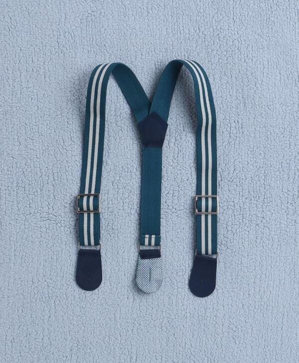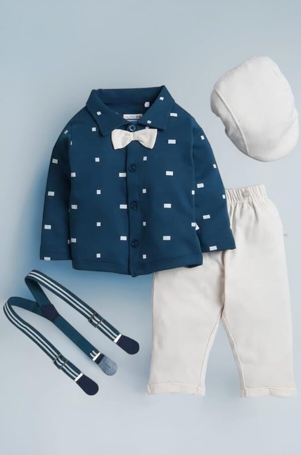 The set includes 1 printed full sleeves shirt, 1 pant, 1 suspender, and 1 cap for a complete stylish outfit.