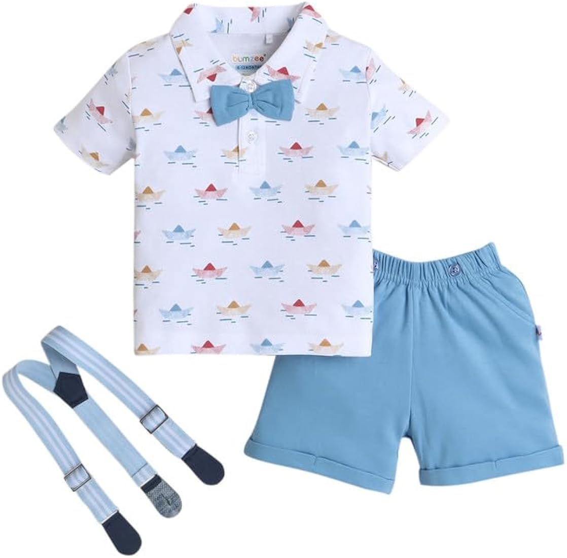 The set includes 1 printed half sleeves T-shirt, 1 short, and 1 suspender for a trendy look.