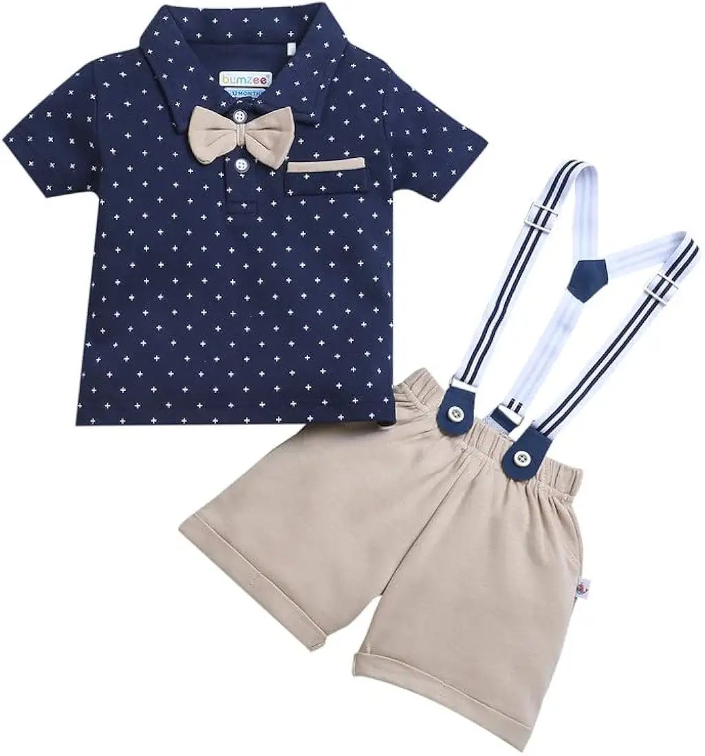 The set includes 1 solid T-shirt, 1 short, and 1 suspender for a trendy outfit.