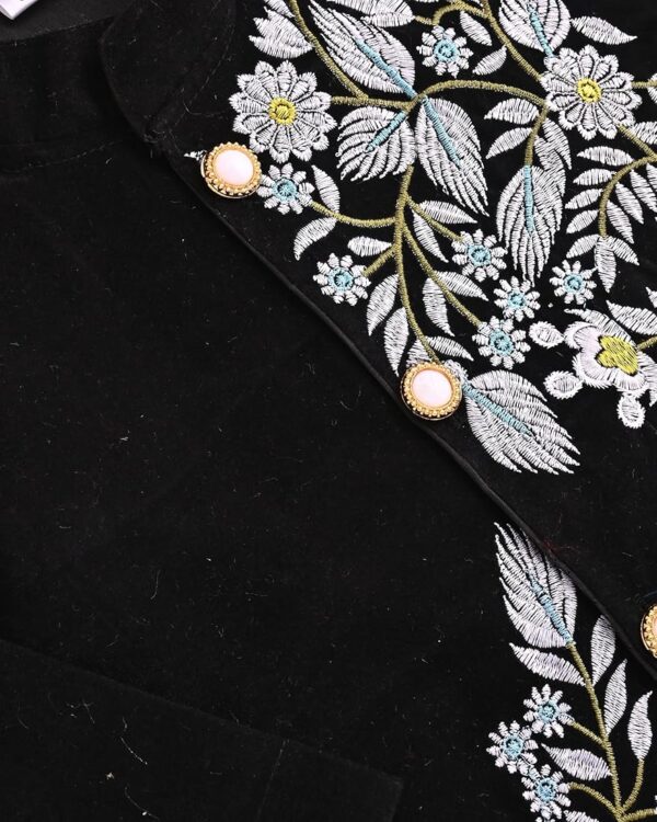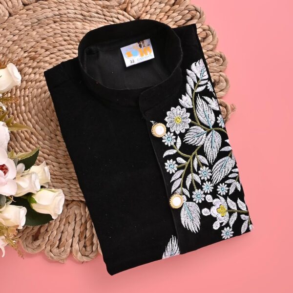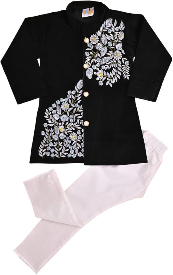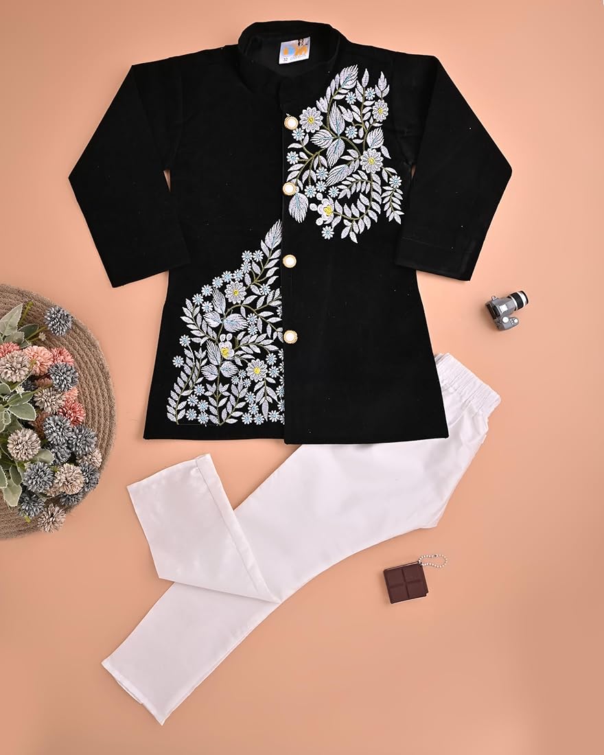 The classic black color adds a royal and sophisticated touch, making this sherwani set an excellent choice for special occasions where your child can stand out with an elegant ethnic look.