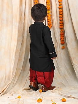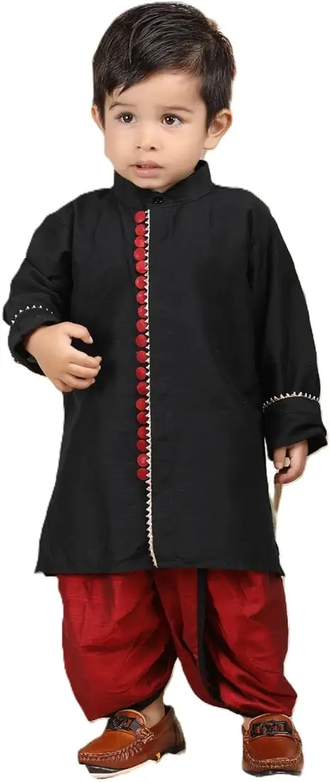 The vibrant red dhoti combined with the elegant black kurta adds a royal and celebratory touch, making it ideal for Diwali, Eid, family gatherings, school cultural programs, and birthday celebrations. The dhoti is designed for easy wear with a comfortable waistband, allowing your child to enjoy festivities without any discomfort.