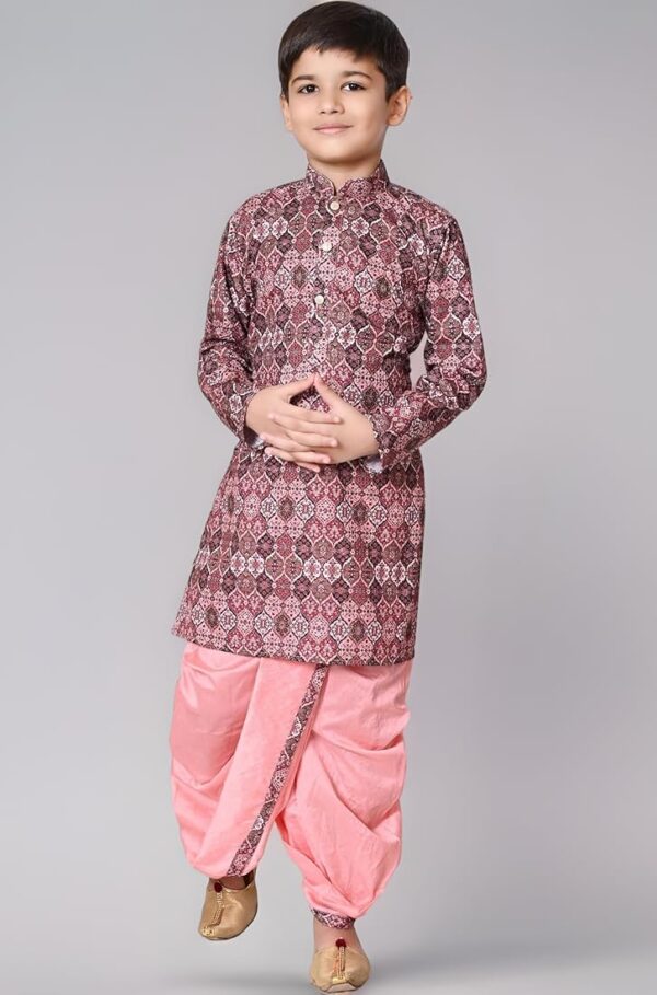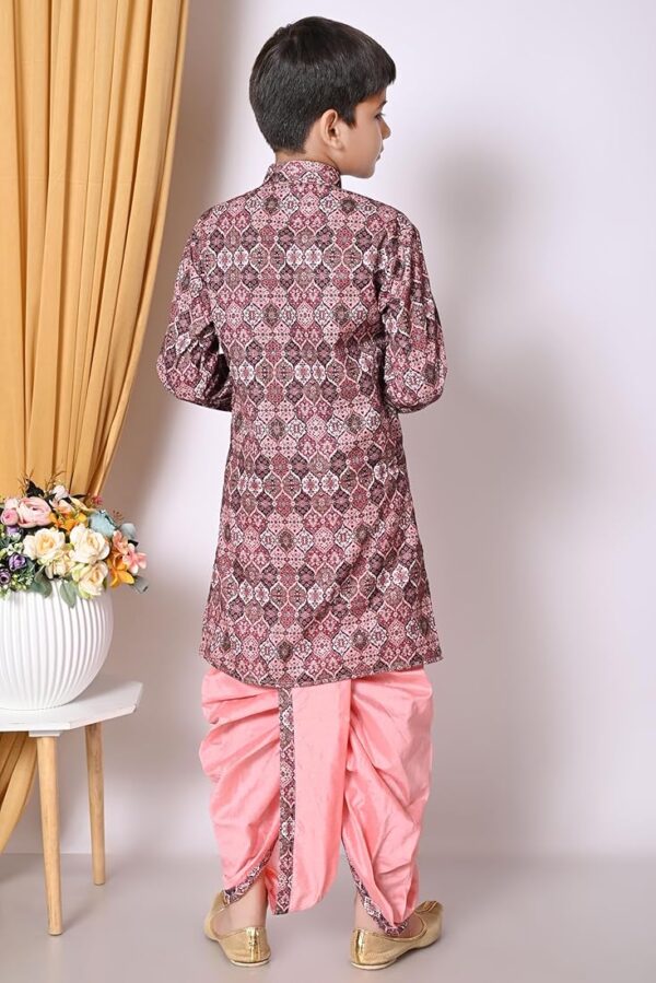 Let your child shine in traditional style with this Boys Ethnic Dupion Silk Printed Embroidery Kurta Pyjama (Pink). Designed with elegant printed patterns and delicate embroidery, this outfit brings together classic ethnic charm and modern festive fashion.
