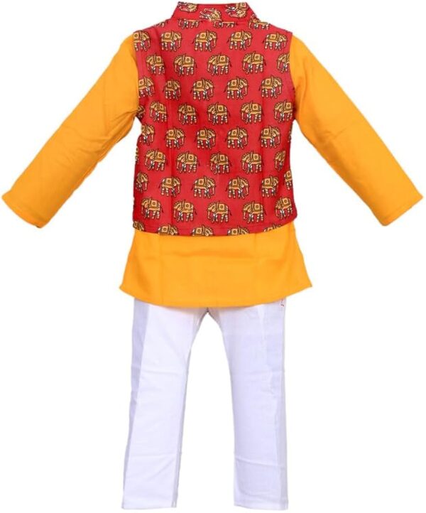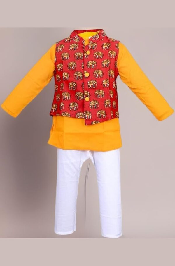 A stylish Boys Ethnic Traditional Wear Set with Jacket featuring a kurta, pajama, and Nehru jacket for a complete festive look. Made from soft and comfortable fabric, this outfit is perfect for weddings, festivals, parties, and cultural events, giving your child a smart and traditional appearance.