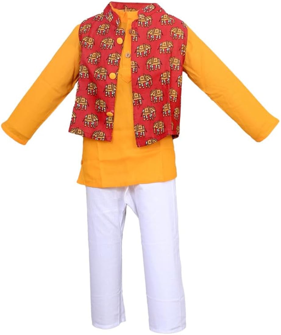 Give your little one a charming traditional look with this Boys Kids Ethnic Traditional Wear Set with Jacket, specially designed for festive occasions and celebrations. This stylish outfit includes a comfortable kurta, matching pajama, and a smart Nehru jacket, creating a complete ethnic ensemble that blends tradition with modern fashion.