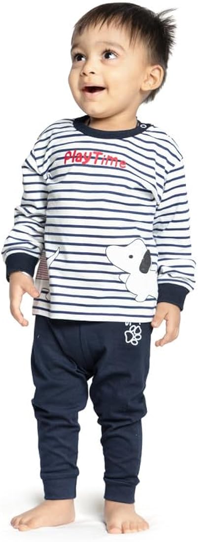 The set includes a comfortable full sleeve top paired with matching pants, designed with a relaxed fit so your baby can move freely and comfortably. The pants feature an elastic waistband, ensuring a secure and flexible fit without causing discomfort.