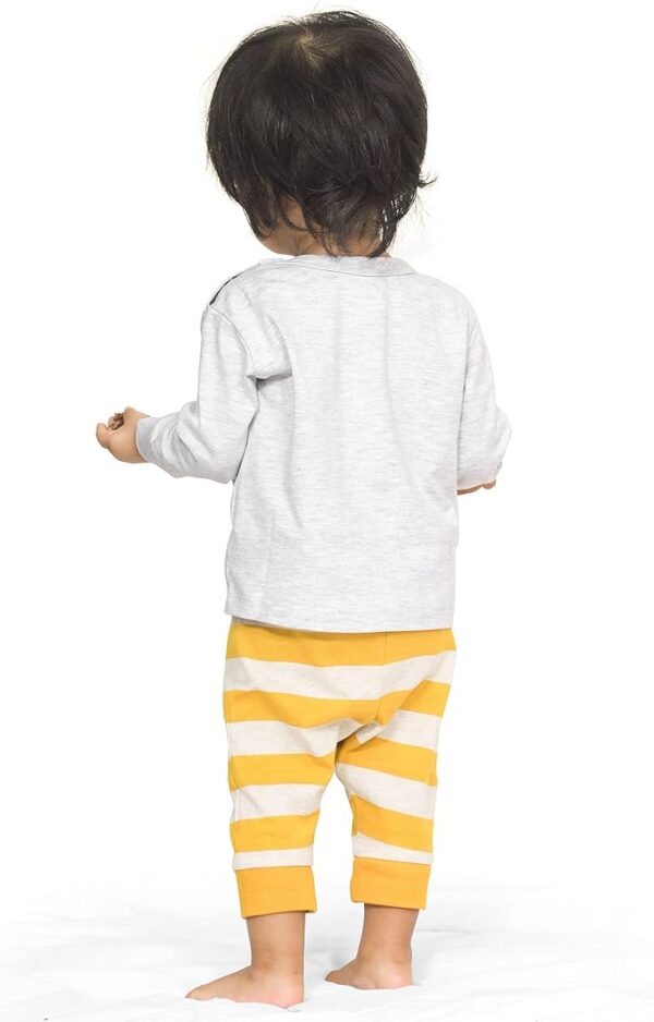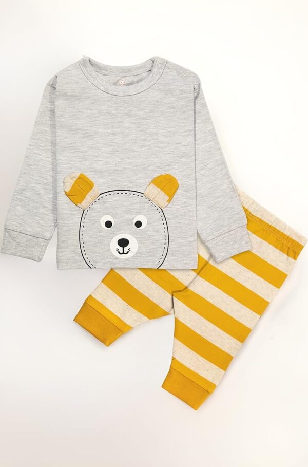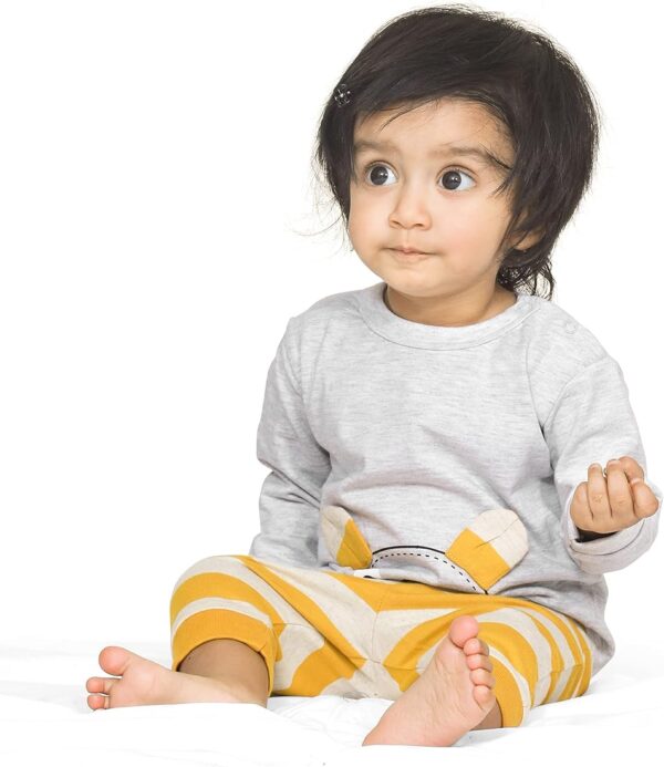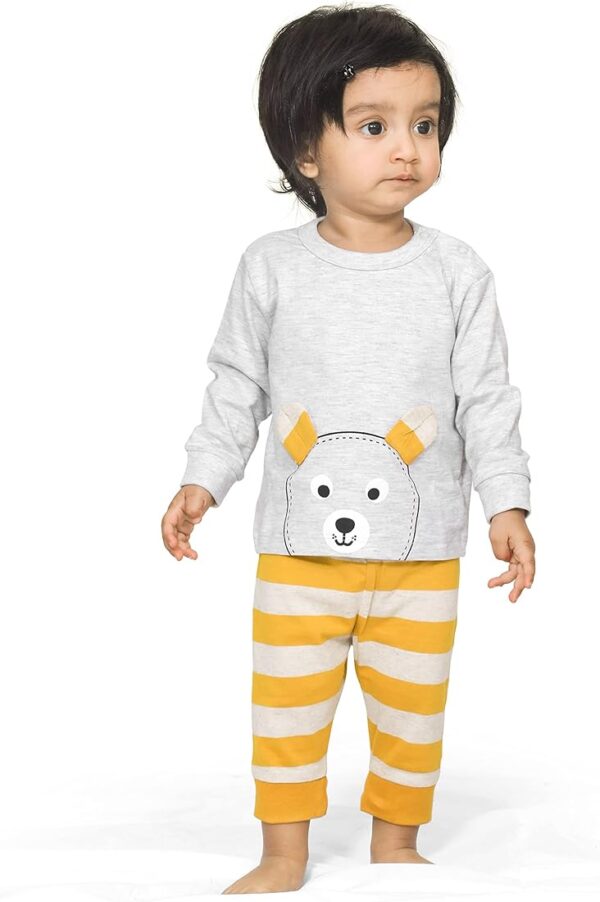 The set includes a comfortable full sleeve top paired with matching pants, designed with a relaxed fit so your baby can move freely and comfortably. The pants feature an elastic waistband, providing a secure and flexible fit without causing discomfort.