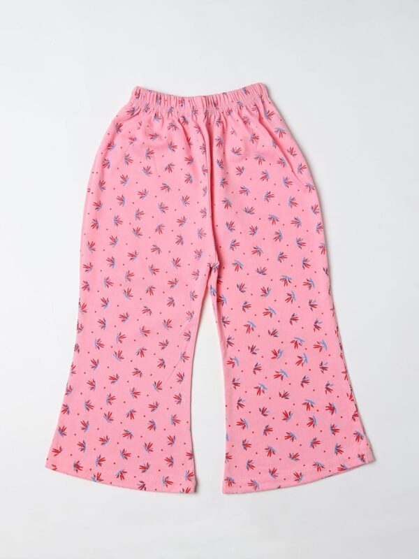 The set includes a printed top paired with matching palazzo bottoms, designed with a relaxed fit for easy movement while sleeping or lounging. The palazzo features an elastic waistband, providing a secure and comfortable fit throughout the night.
