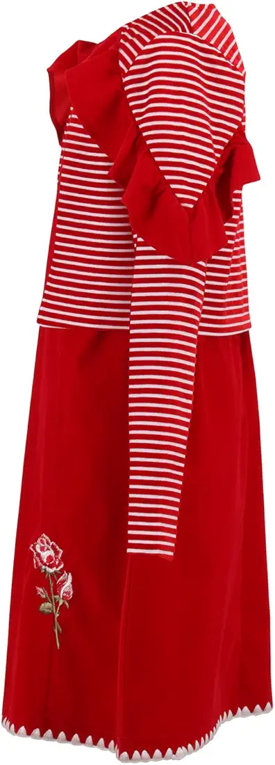 Girl Child Red Velvet Solid Dress 2-Piece Set – Elegant red velvet dress with a stylish striped shrug and bow accents