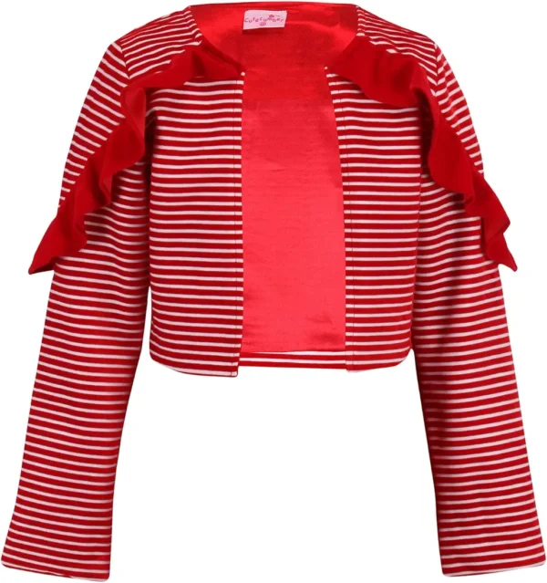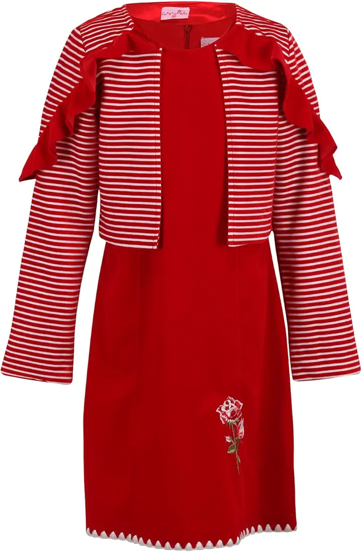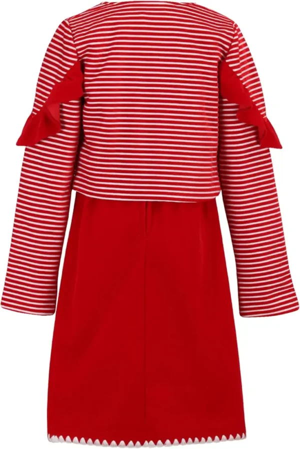 Girl Child Red Velvet Solid Dress 2-Piece Set includes a beautiful red velvet dress with a striped shrug and bow accents.