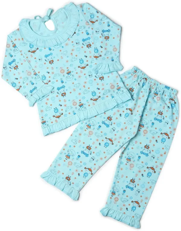 This Girl Night Suit / Cotton Printed Full – Blue is made from soft and breathable cotton for all-night comfort. It includes a full sleeve top and matching bottoms with an elastic waistband for a relaxed fit. Perfect for sleepwear, nightwear, and comfortable home wear. 🌙👧