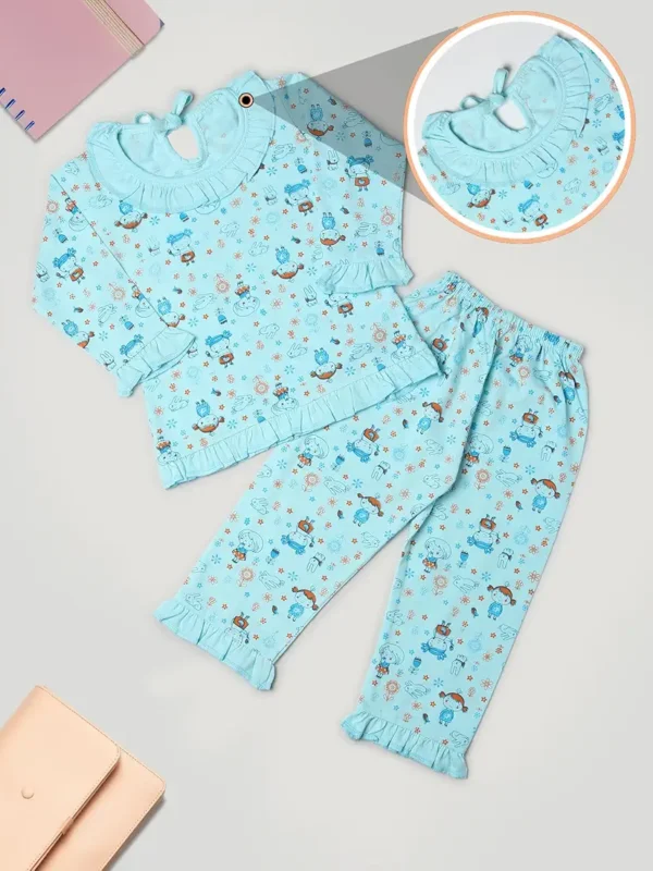 The beautiful blue color with cute prints adds a fun and stylish touch, making this night suit ideal for sleepwear, nightwear, and lounging at home. This cotton night suit combines softness, comfort, and charming style for girls.