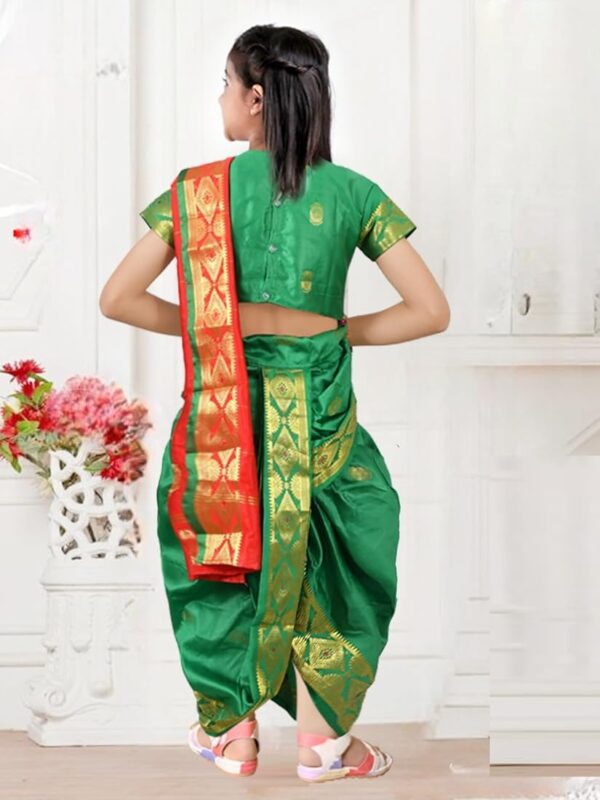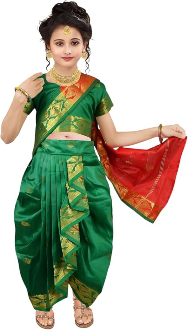 The set includes a beautiful green saree paired with a matching blouse, creating a complete traditional ensemble that is both stylish and comfortable. Crafted from soft and breathable fabric, it ensures ease of movement while keeping your child comfortable throughout the day.