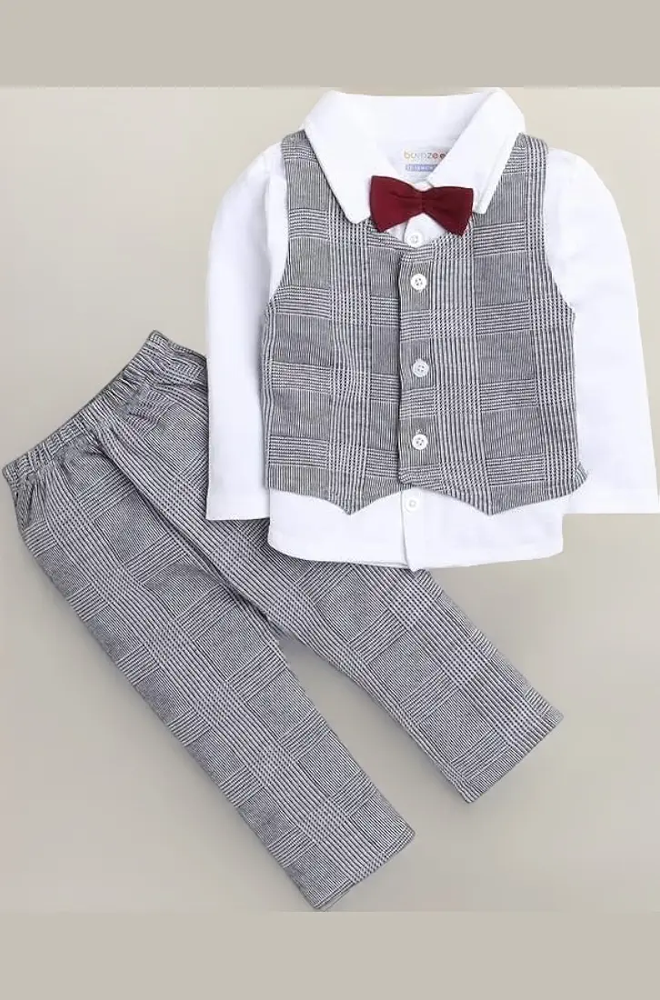 Grey & White Boys Shirt Waistcoat Set – Stylish cotton formal outfit with shirt, waistcoat, and pant for a smart look.