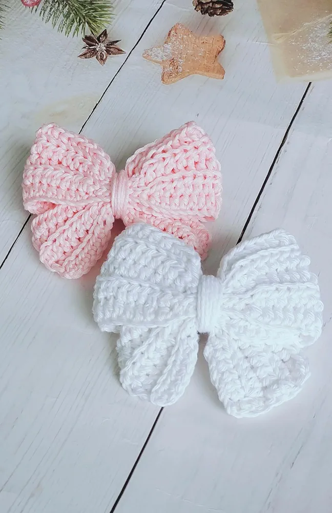 Handmade Crochet Hair Bows (Pink & White) – Beautiful handmade hair bows with a soft crochet design, perfect for cute and stylish hair styling.
