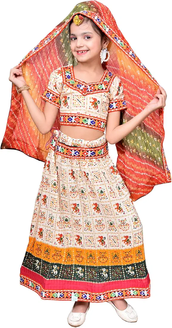 The set includes a flared Ghoomar skirt with matching blouse and dupatta, creating a complete ethnic ensemble. Made from soft, breathable fabric, it ensures comfort while allowing your child to move freely and enjoy the festivities.