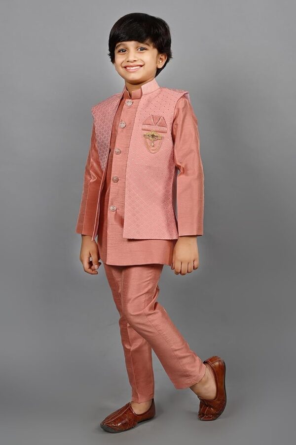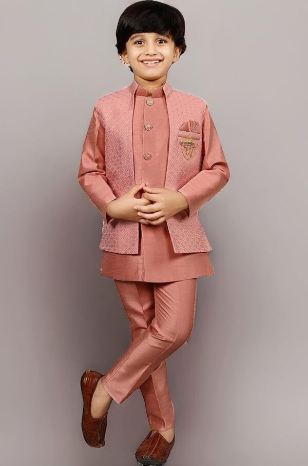 Make your little boy the star of any celebration with this Kids Ethnic Silk Bollywood Style Print Indo-Western Sherwani Set in Pink. Combining classic Indian elegance with modern Indo-Western styling, this outfit is perfect for weddings, festivals, birthday parties, and cultural events.