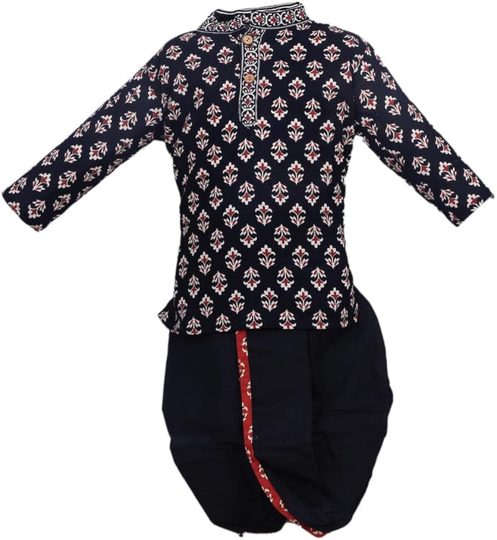 The set includes a full-sleeves kurta paired with a matching dhoti, creating a complete traditional ensemble. Made from soft, breathable pure cotton, it ensures all-day comfort while allowing your child to move freely.