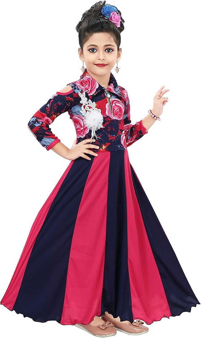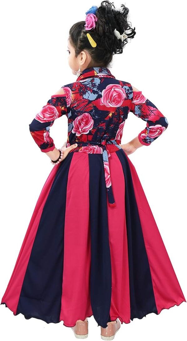 Kids Maxi Gown Dress for Girls features a beautiful multi-colour design with floral and colour block patterns.