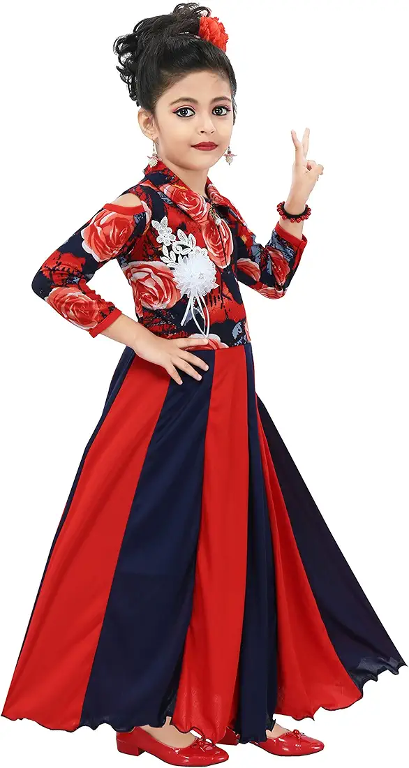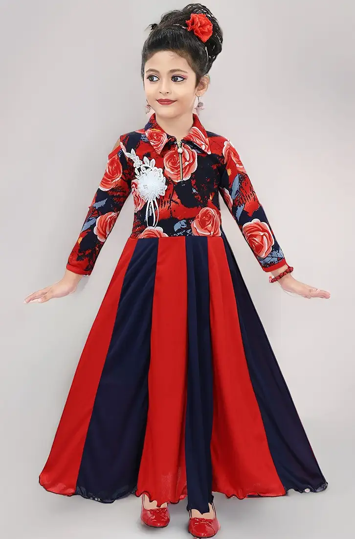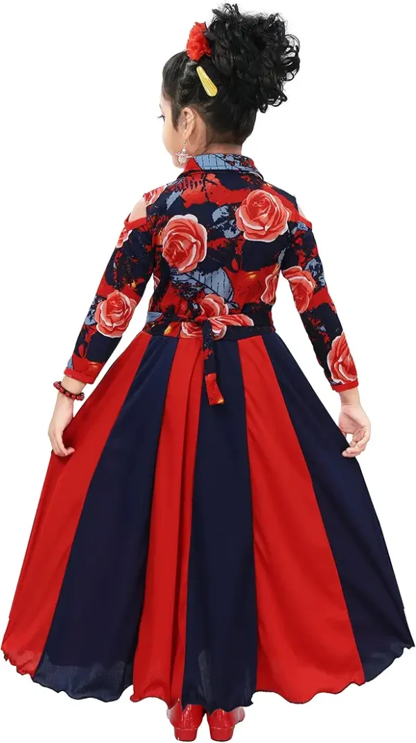 Kids Maxi Gown Dress for Girls features a beautiful multi-colour design with floral and colour block patterns.