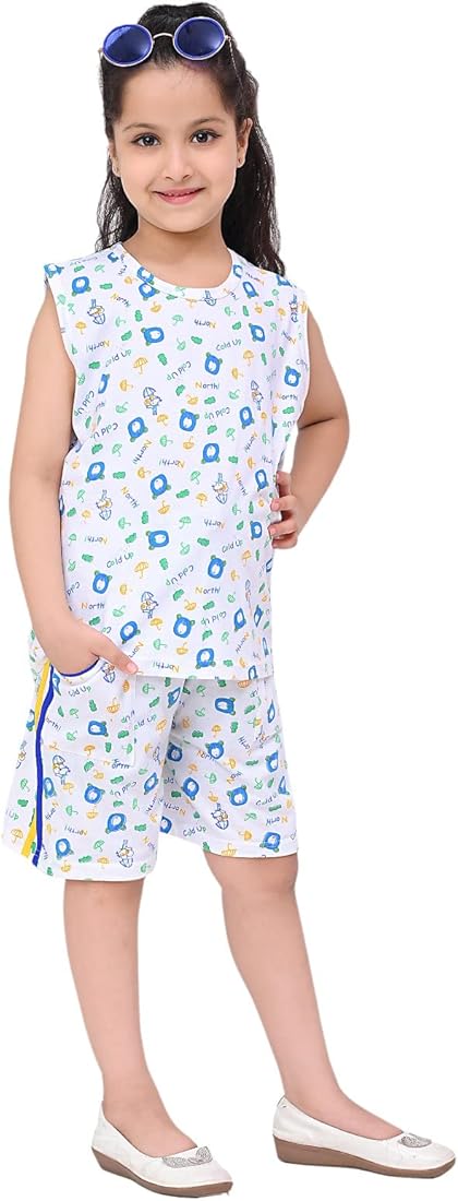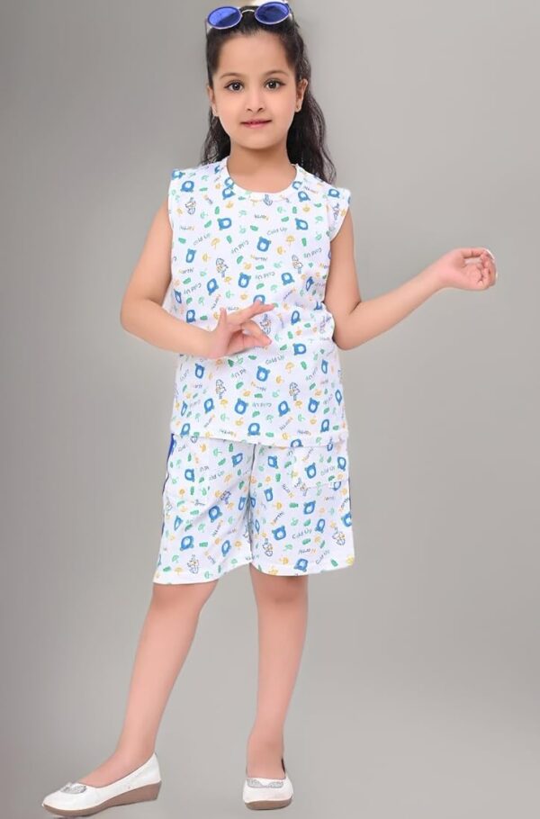 This Kids Night Wear for Girls – Summer Night Suit (Blue) is made from soft and breathable cotton for all-night comfort. It includes a short-sleeve top and matching shorts with an elastic waistband, perfect for sleepwear, summer nights, and cozy home wear. 🌙👧