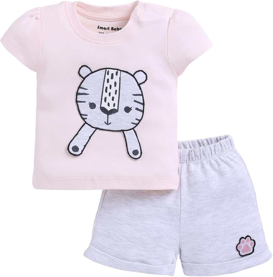 Smart Baby 100% Cotton Interlock Fabric T-Shirt and Shorts Set for Baby Girls – Soft, Lightweight, Comfortable (Pack of 1) – (pink Grey)