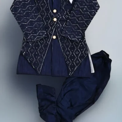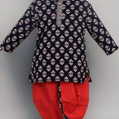 Traditional Printed Kurta Pyjama Set for Boys features a navy blue kurta with elegant all-over print and decorative buttons.