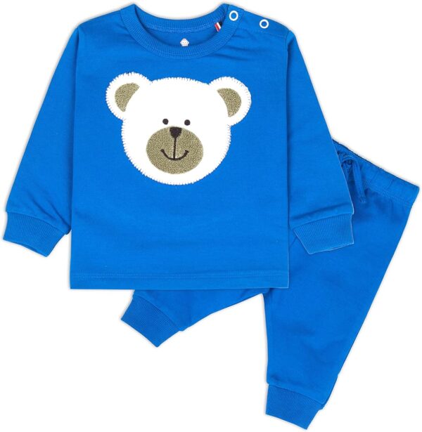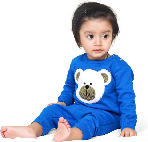 Unisex Cotton Fleece Full Sleeve Track Suit for Boys & Girls (Blue Polar Design) made from soft fleece cotton fabric. Includes full sleeve sweatshirt and elastic waist track pants, perfect for winter wear, casual outings, and everyday comfort for kids.
