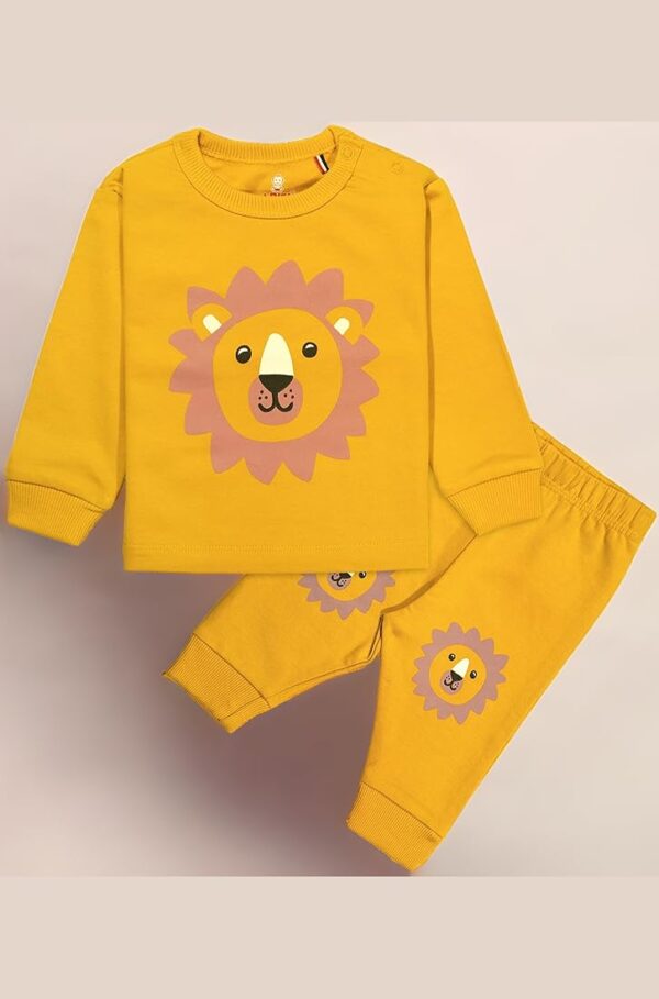 Unisex Cotton Fleece Full Sleeve Track Suit for Boys & Girls (Yellow Lion Design) made from soft fleece cotton fabric. Includes full sleeve sweatshirt and elastic waist track pants, perfect for winter wear, casual outings, and everyday comfort for kids.