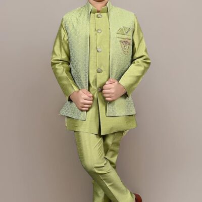 Kids Ethnic Silk Indian Bollywood Style Print Indo-Western Sherwani Set for Boys (Green) – Traditional & Party Wear
