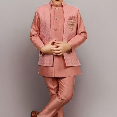 Kids Ethnic Silk Indian Bollywood Style Print Indo-Western Sherwani Set for Boys (Pink) – Traditional & Party Wear